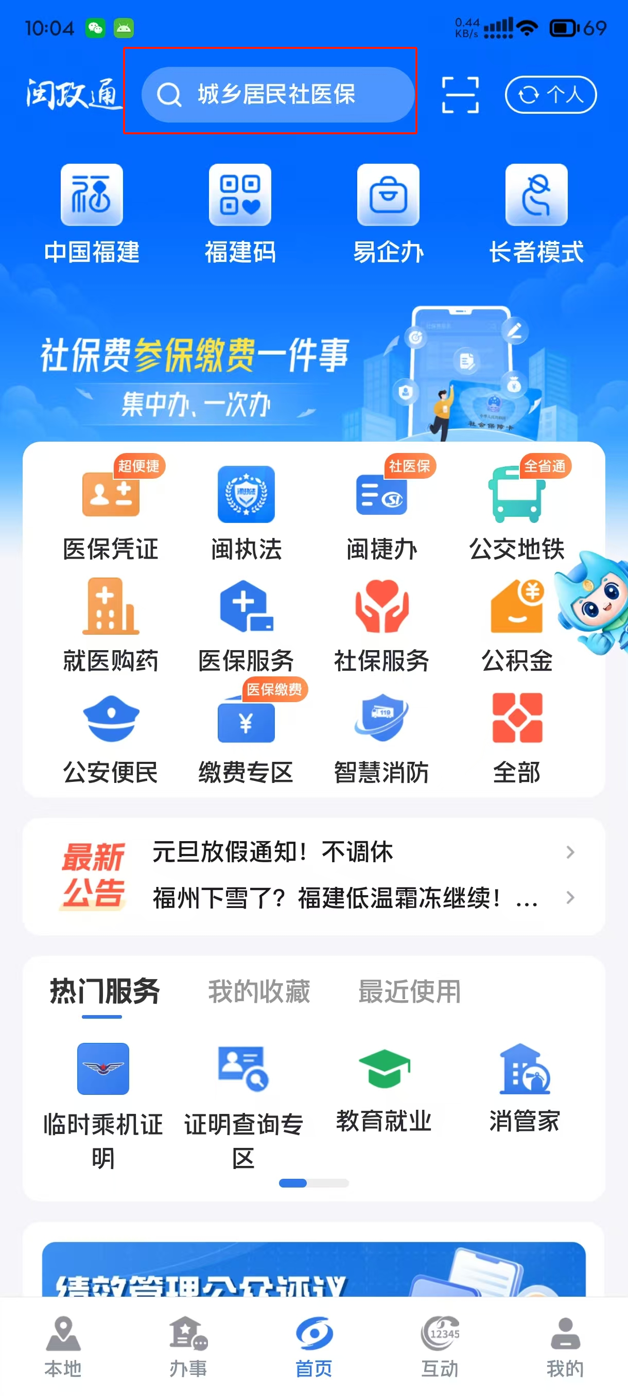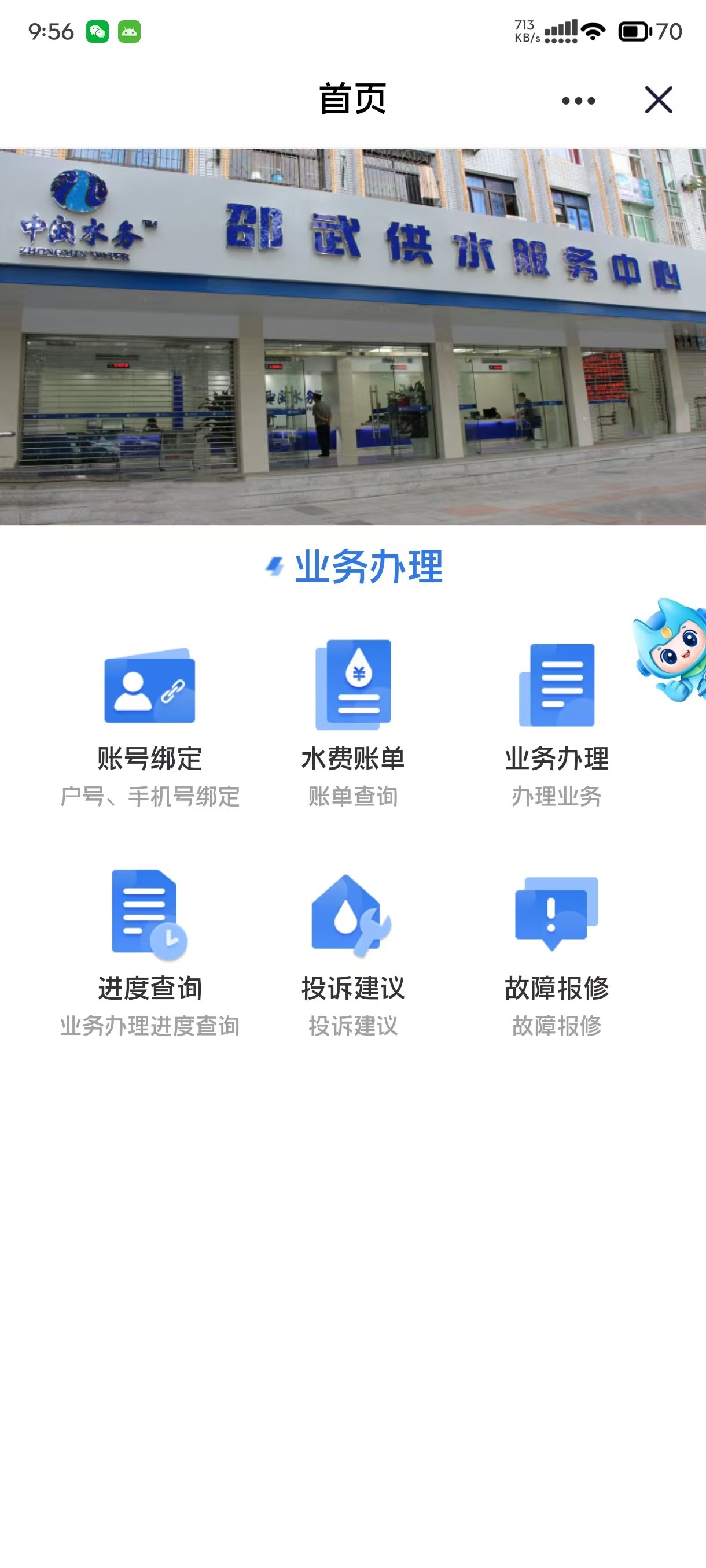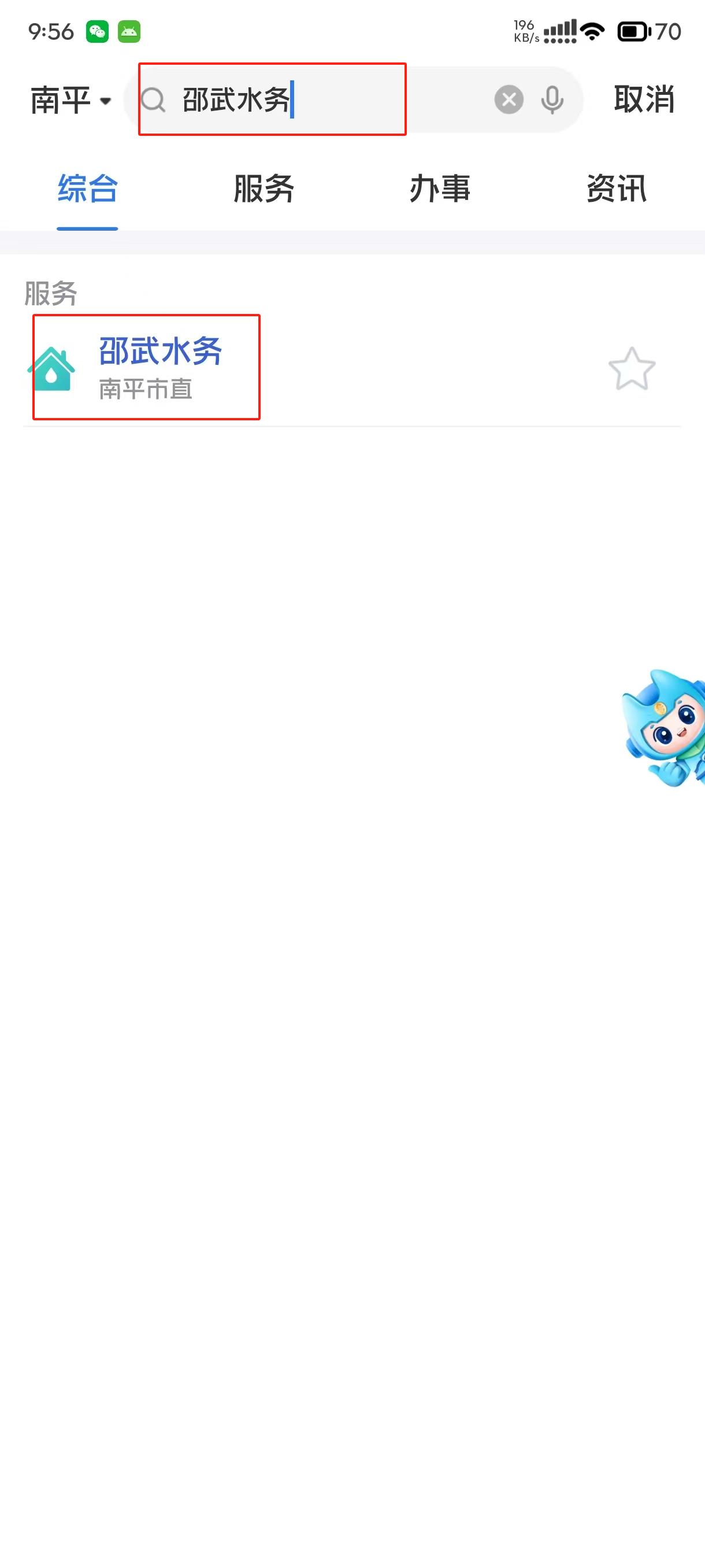 方式一:“闽政通”首页搜索栏输入“邵武水务”,点击即可进入。