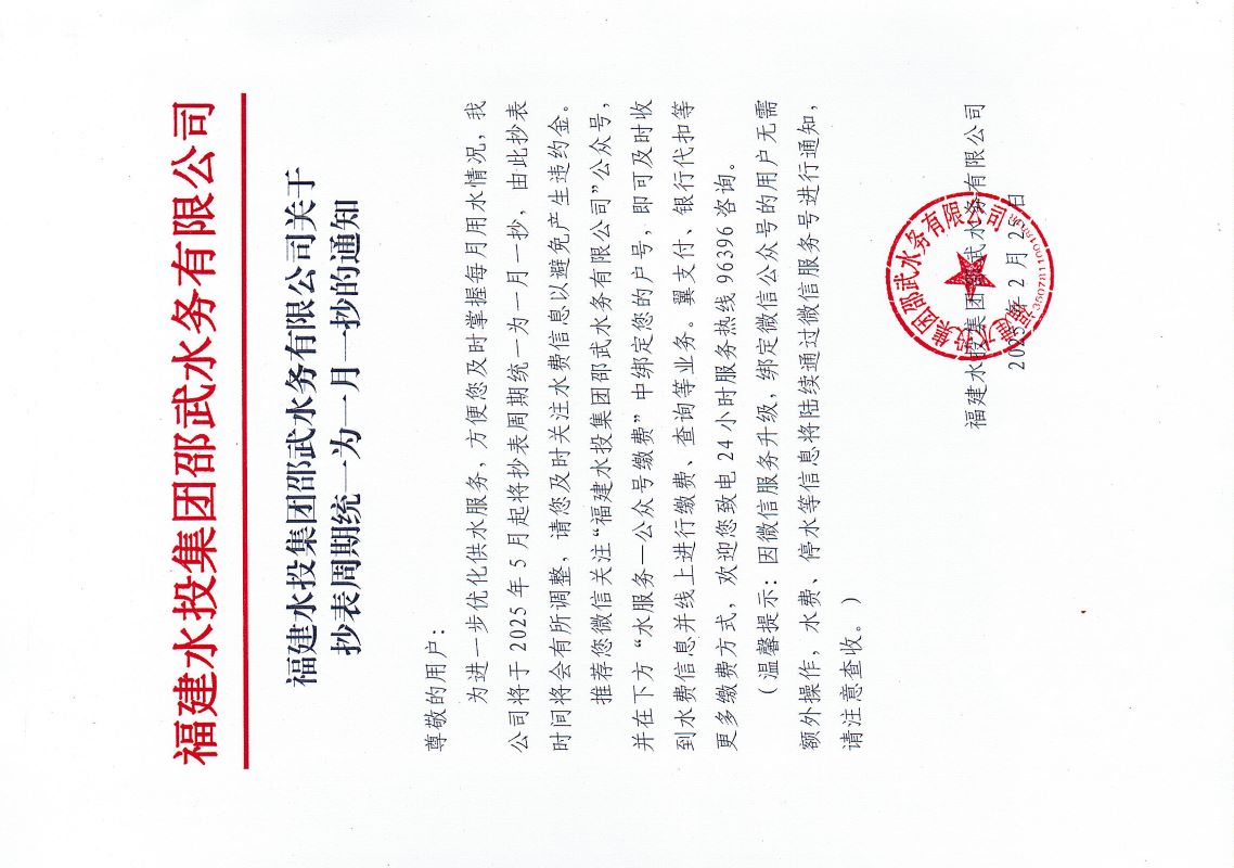 伟德bevictor中文版集团邵武水务有限公司关于抄表周期统一为一月一抄的通知